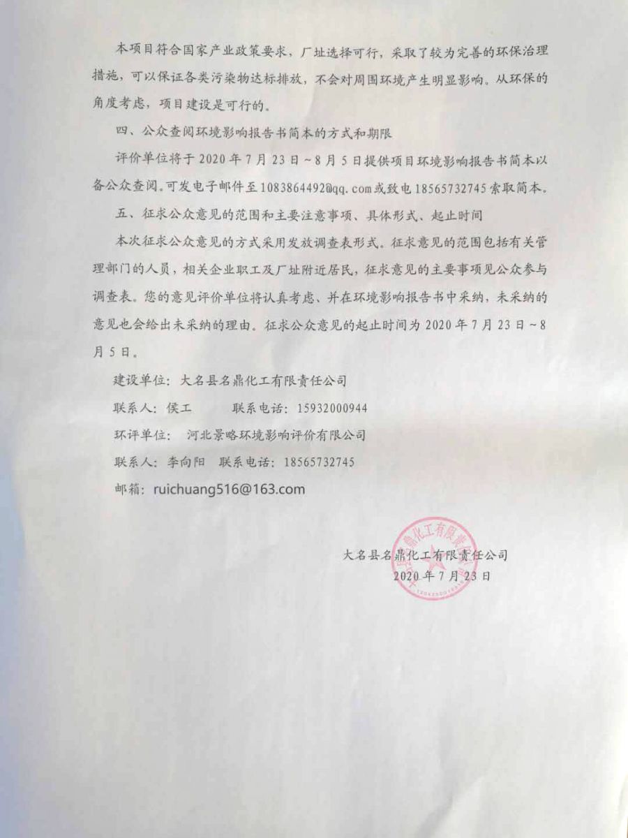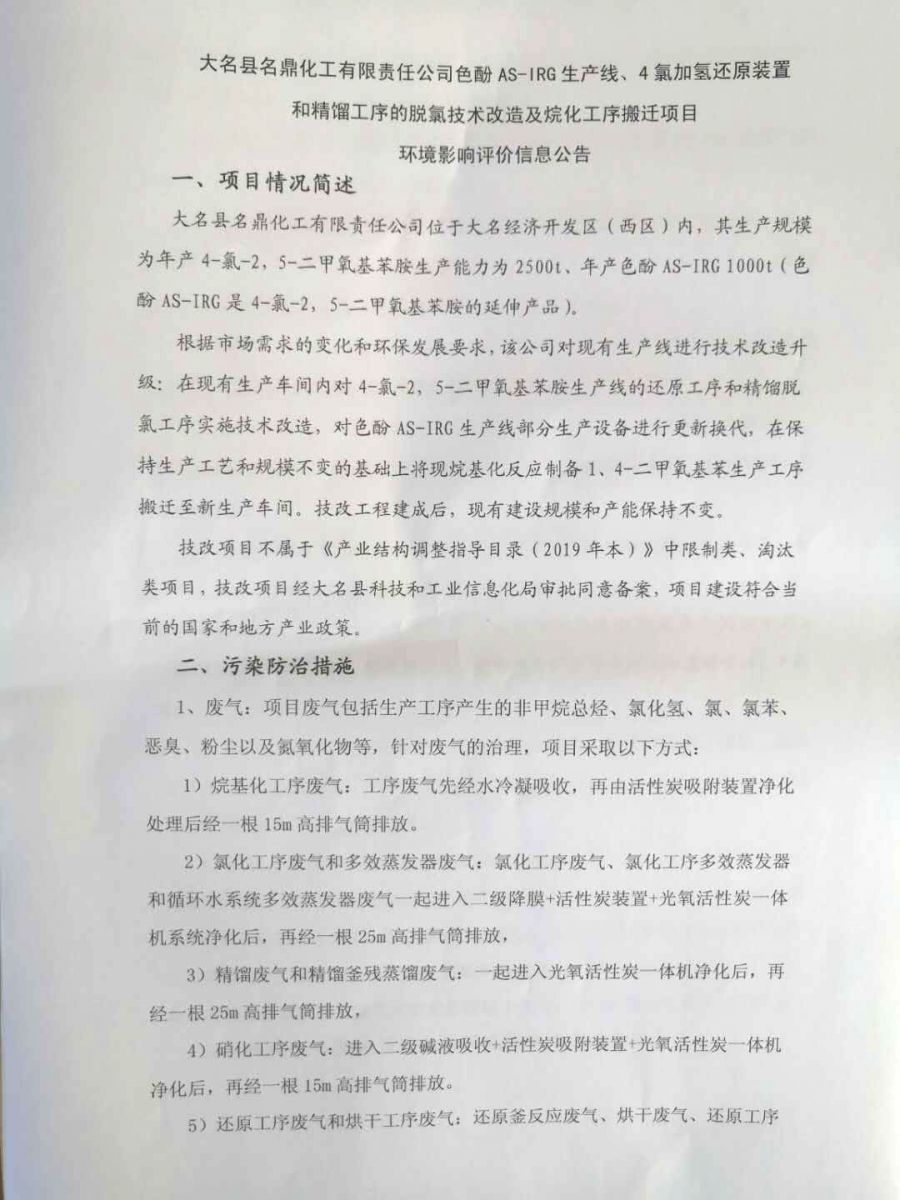 大名縣名鼎化工有限責任公司色酚AS-IRG生產(chǎn)線、4氯加氫還原裝置和精餾工序的脫氯技術改造及烷化工序搬遷項目環(huán)境影響評價信息公告