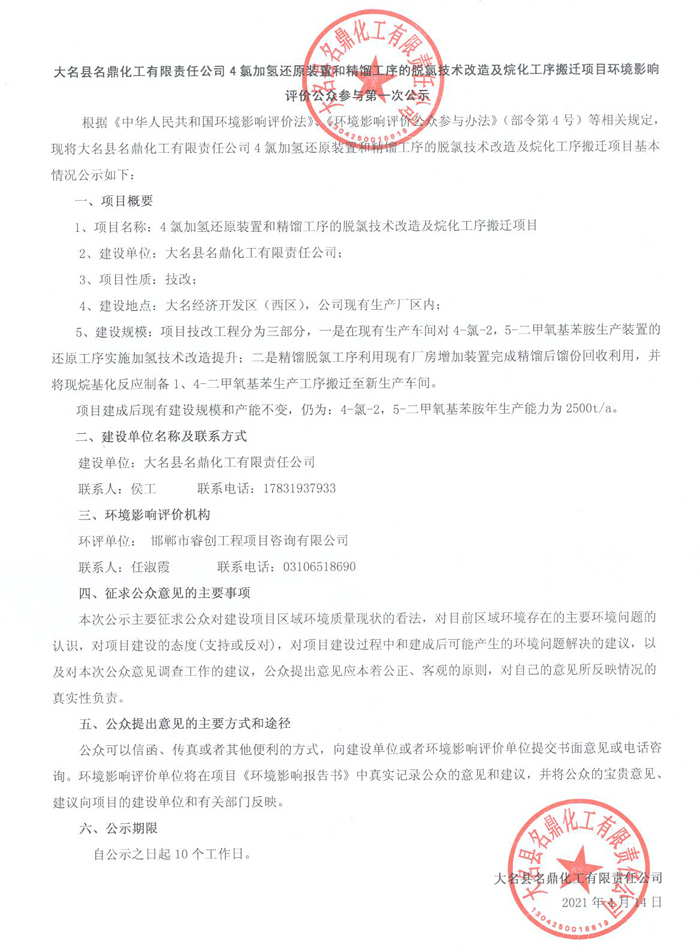 大名縣名鼎化工有限責(zé)任公司 4氯加氫還原裝置和精餾工序的脫氯技術(shù)改造及烷化工序搬遷項(xiàng)目環(huán)境影響評(píng)價(jià)公眾參與第一次公示
