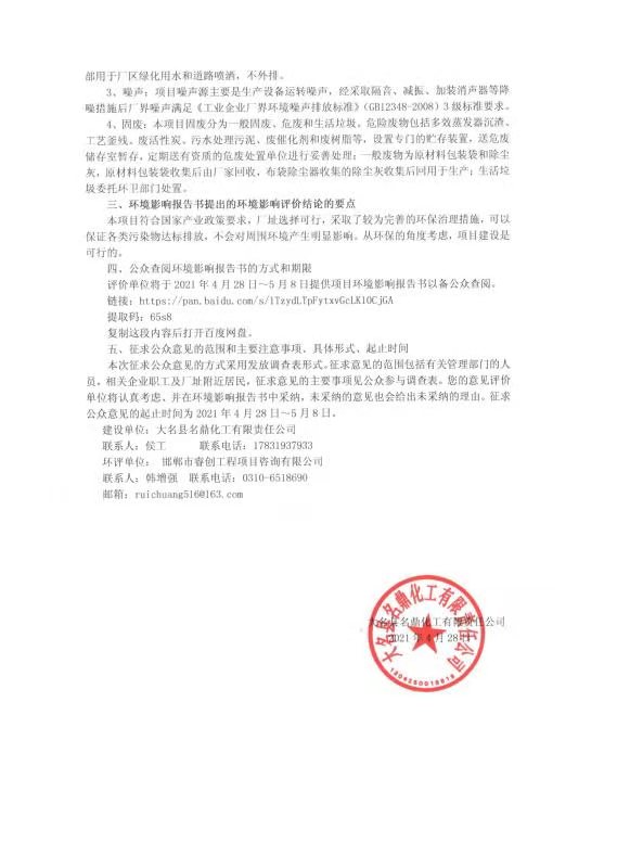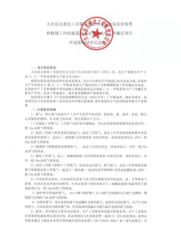 大名縣名鼎化工有限責任公司 4氯加氫還原裝置和精餾工序的脫氯技術改造及烷化工序搬遷項目環(huán)境影響評價信息公告